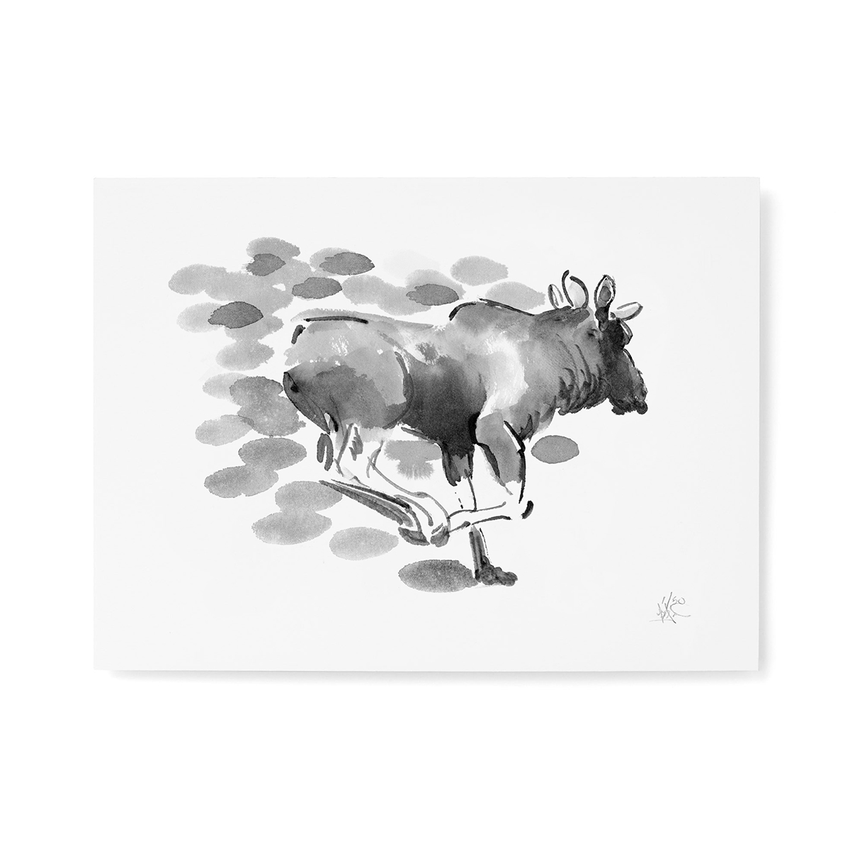 This fine art print features Moose on the move. The fine art print is a part of a limited set of 50 prints, signed and numbered by the artist.